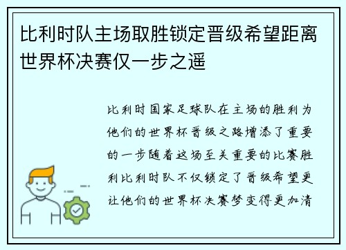 比利时队主场取胜锁定晋级希望距离世界杯决赛仅一步之遥